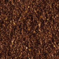 Chapelure, tourteau de coprah, chenevis moulu grillé (15%), biscuit, PV1 (blé, mélasse), maïs, coriandre (9%)