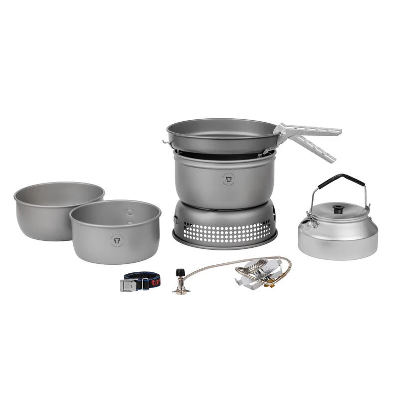 Cet appareil de cuisson Trangia de la série 25-HA est compact et robuste. Comprenant un support de brûleur, un brûleur à alcool/esprit et diverses casseroles.